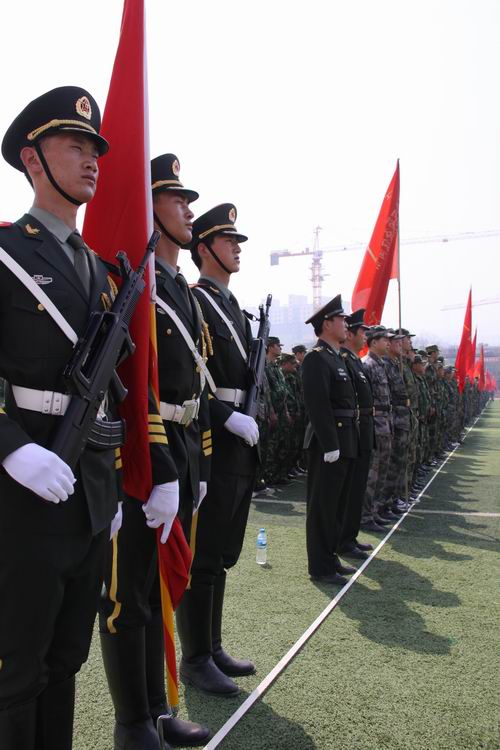 上午10時,點驗大會在嘹亮的軍歌聲中拉開序幕。預(yù)備役官兵軍容嚴整,雄姿勃發(fā),精神抖擻,士氣高昂,充分展示了當代預(yù)備役軍人的良好精神風貌,展現(xiàn)了部隊良好的軍政素質(zhì)和優(yōu)良的戰(zhàn)斗作風。3名儀仗隊員護衛(wèi)著軍旗,邁著矯健的步伐從主席臺南側(cè)走到隊列北側(cè)。1500余人的預(yù)備役軍人身著整齊的軍裝,按照各自編制,在操場排成整齊的方隊,接受了首長的檢驗并進行了宣誓儀式。點驗結(jié)束后,預(yù)備役官兵進行了擒敵拳、盾牌警棍術(shù)和防爆隊形等三個科目的匯報演示。通過集結(jié)點驗,鍛煉提高了團首長機關(guān)和營連各級指揮員的組織協(xié)調(diào)能力,探索研究了組織全團集結(jié)點驗的方法路子,錘煉了部隊,強化了作風,有效提高了部隊快速動員和隨時應(yīng)召的能力。