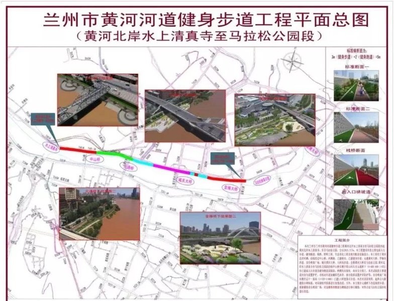 蘭州市黃河河道健身步道工程(黃河北岸水上清真寺至馬拉松公園段)位于黃河北岸河灘,全長2924.317米,西起黃河北岸金城關古建一條街水上清真寺,沿途經過中山橋、元通黃河大橋、羅鍋溝洪道、音樂噴泉廣場、城關黃河大橋、大砂溝洪道、金雁黃河大橋至馬拉松公園。主要建設內容包括人行步道、健身跑道、棧橋、照明工程、生態(tài)美化工程、相關配套設施及中山橋、元通大橋、金雁大橋下和音樂噴泉廣場節(jié)點景觀改造。