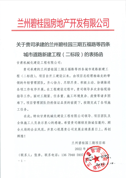 1月10日,我公司收到來自蘭州碧桂園房地產(chǎn)開發(fā)有限公司的表揚(yáng)函,函中提到,蘭州碧桂園三期五福路等四條城市道路新建工程(二標(biāo)段)項目自開工建設(shè)以來,項目人員面對工期緊、任務(wù)重、施工環(huán)境復(fù)雜、疫情等諸多困難,在保證品質(zhì)的前提下,按期完成了各項施工任務(wù),提出表揚(yáng)。