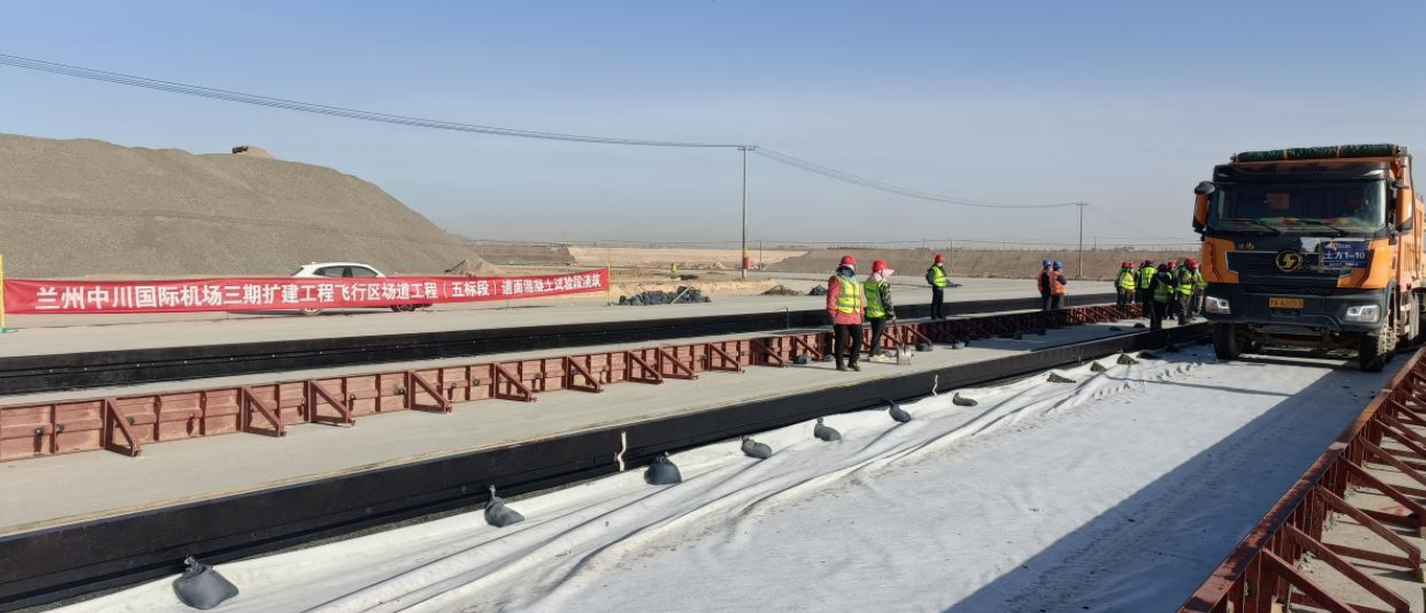 4月20日,由我司承建的蘭州中川國(guó)際機(jī)場(chǎng)三期擴(kuò)建工程飛行區(qū)場(chǎng)道工程(五標(biāo)段)道面混凝土試驗(yàn)段正式開倉(cāng)澆筑。