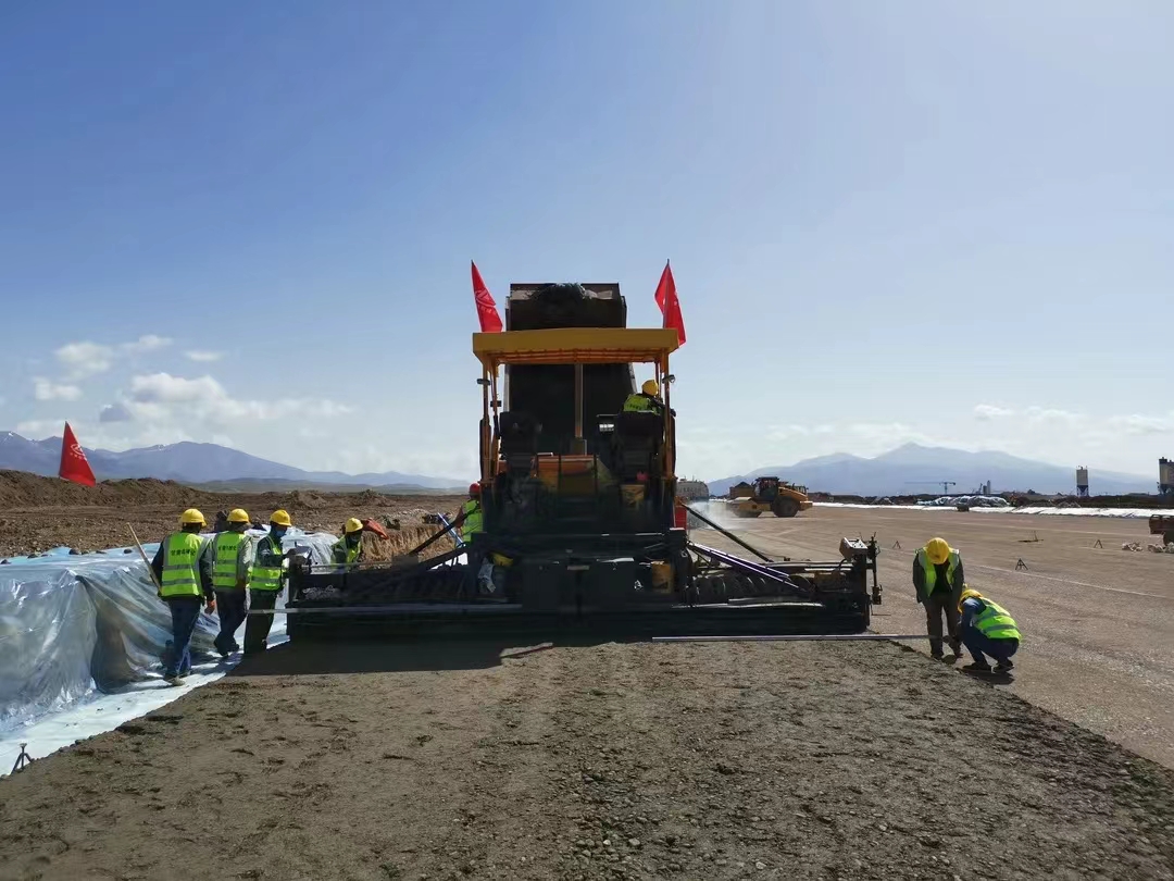 5月28日,伴隨著第一車(chē)水泥穩(wěn)定砂礫混合料緩緩倒入攤鋪機(jī)料斗,標(biāo)志著由我司承建的新疆和靜(巴音布魯克)機(jī)場(chǎng)飛行區(qū)跑道水穩(wěn)基層試驗(yàn)段施工正式拉開(kāi)序幕。